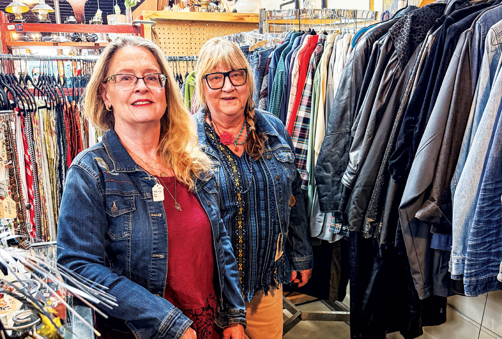 Park Hill Treasures store owners Kate Hakala (left) and Suzi Chierchie modeled upcycled denim jackets.