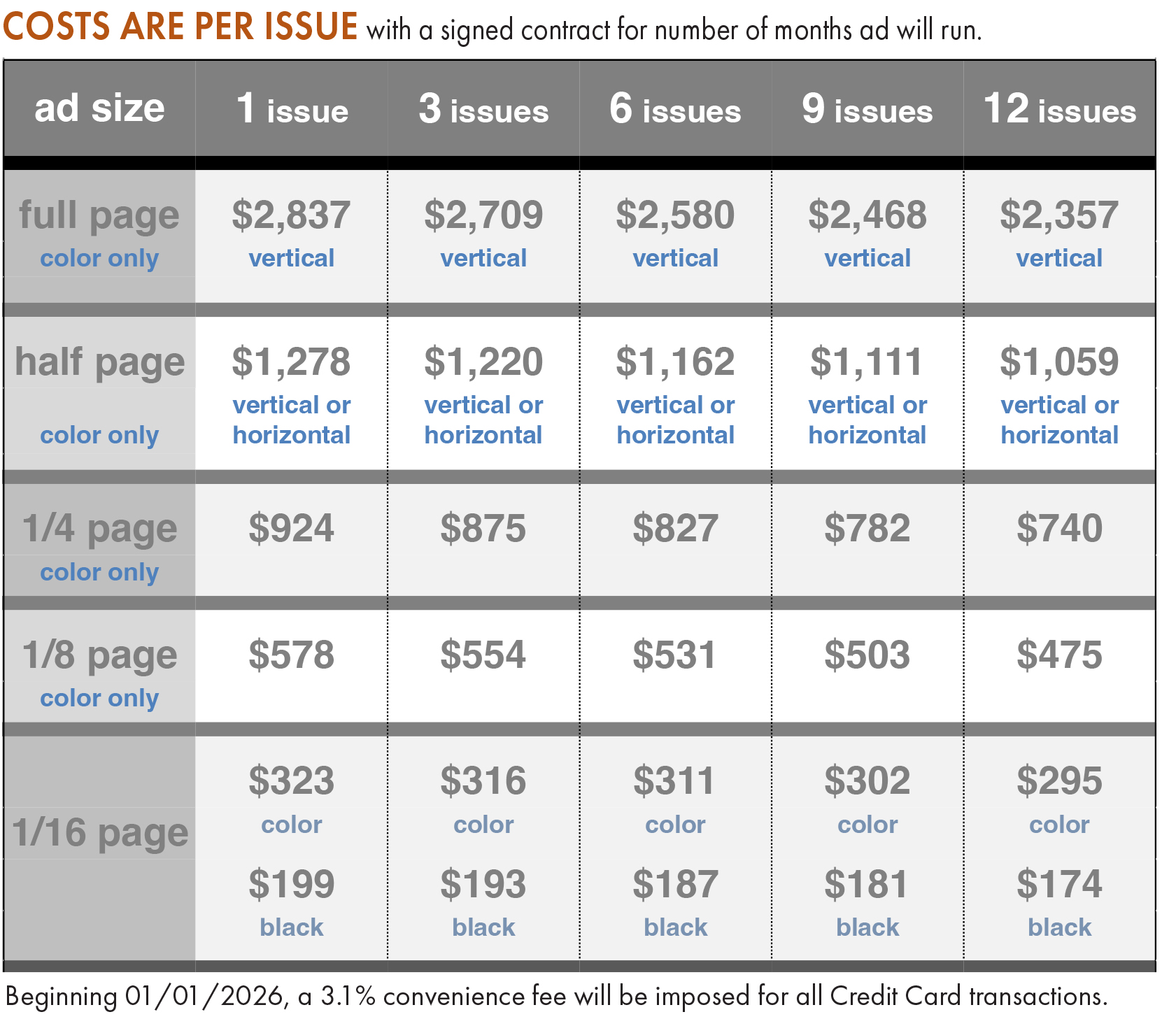 Reservation and payment are due by the 15th of the month PRIOR to distribution to ensure insertion in the upcoming issue.