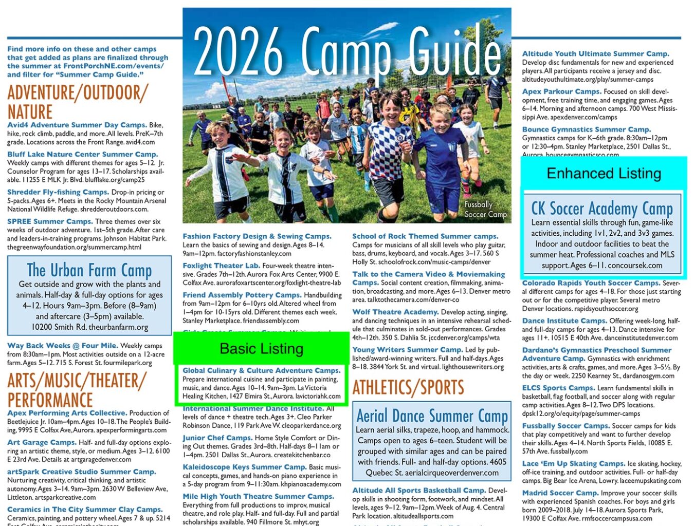 A $50 Enhanced Listing includes your camp name, brief description, address, website, and age range in a format with increased font size and highlighted in a blue box. This listing will appear in print and online with a single-click hyperlink in our online Summer Camp Guide section at www.FrontPorchNE.com. OUR ENHANCED LISTINGS ARE SOLD OUT!