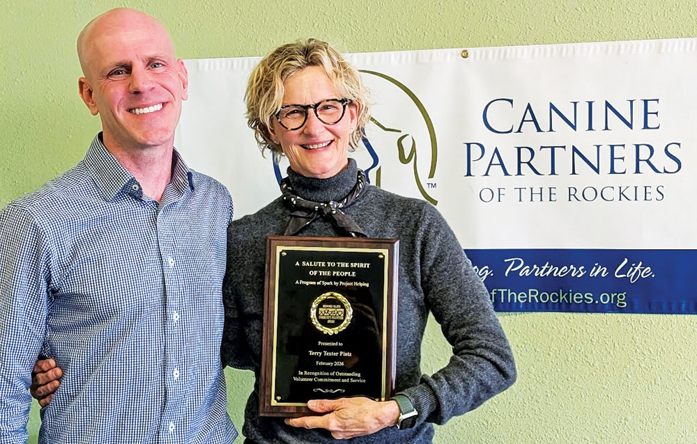 Kyle Lephart, executive director of Canine Partners of the Rockies, congratulated Terry Platz on her volunteer award. Courtesy of Canine Partners of The Rockies