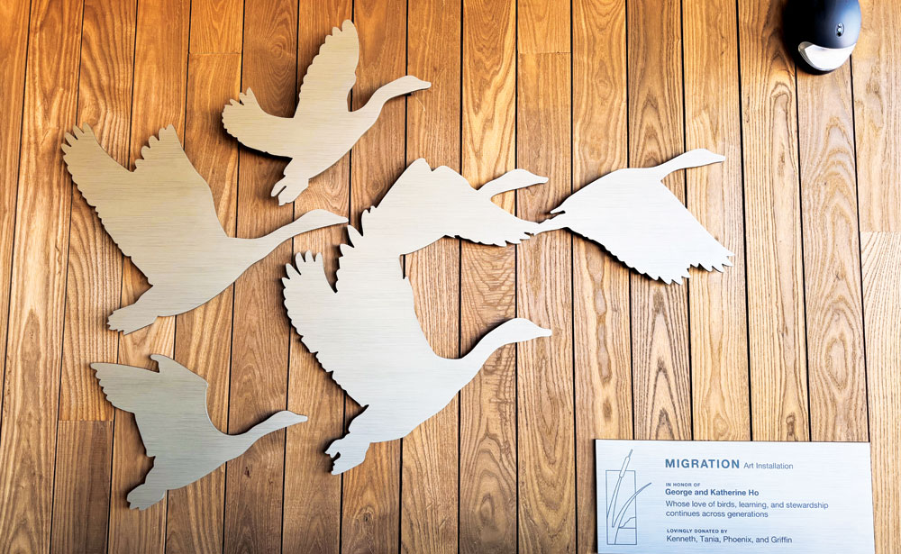 A metal sculpture of geese in flight hangs on a wall outside the nature center buildings to honor George Ho. Front Porch photo by Christie Gosch