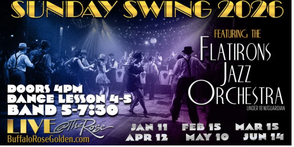 A special evening for fans of big band and swing dancing at the historical Buffalo Rose in downtown Golden. Doors open and delicious food service starts at 4:00. Learn to swing dance with a free dance lesson 4:00-5:00! Then enjoy entertaining live BIG BAND JAZZ MUSIC from 5:00 to 7:30 by the Flatirons Jazz Orchestra – featuring Deborah Stafford, rated “Best Big Band in Denver” by CBS Local, FJO is a traditional 18-piece big band. Dance or just enjoy the great Swing Era music of Count Basie, Duke Ellington, Benny Goodman and more played on one of Colorado great historic stages. All ages welcome.