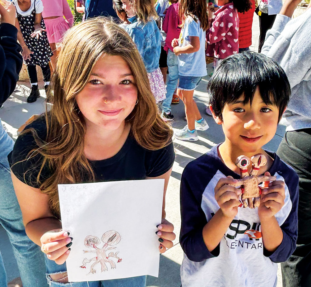 A high school student holds a crayon drawing from an elementary student that inspired their clay creation. Photo courtesy of Northfield High School