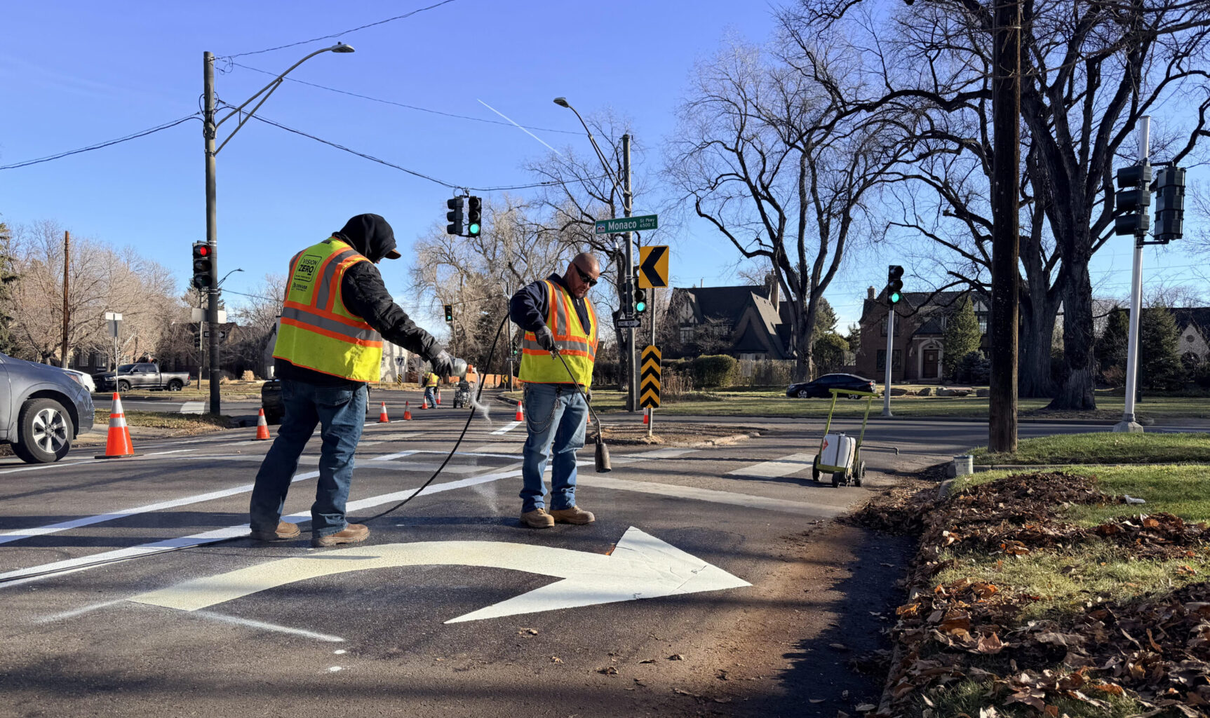 City workers installed new signs and reflective street markings in mid-December to improve safety at the intersection of 17th Ave. and Monaco St. Pkwy. Neighbors say it’s not enough.