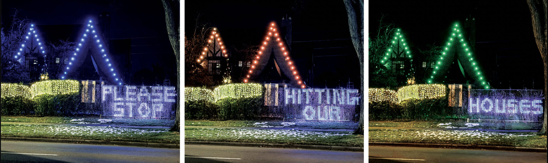 In the meantime, some are taking matters into their own hands. This fall, Stoll’s neighbor erected a large electronic sign that has flashing red arrows and a message that says, “Please stop hitting our houses.” Stoll, meanwhile, has installed large boulders on his lawn to try to prevent cars from reaching his house.