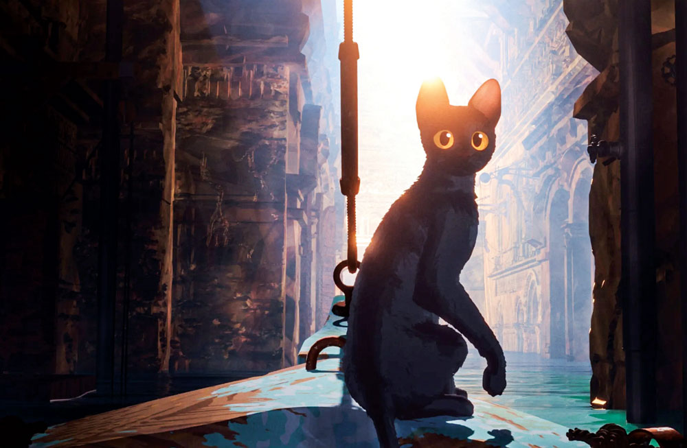 The wonderful story centers around a grey cat that is wandering around a human-less and nondescript world. Trees, streams, and bizarre sculptures of cats dot the immediate landscape as our hero dodges dogs and other predators on its travels. The cat lives in an abandoned house, content in a bed by an open window. The landscape quickly changes, however, as a tidal wave subsumes everything. The cat lands on solid ground and finds its way back to the house, but the surrounding water level rises quickly. The cat finds refuge in a boat as the house is overrun by water. That boat is already home to a large, harmless rodent (a capybara—I had to look this one up) that soon falls asleep, indifferent to the cat. Along the way, the boat picks up a dog, a lemur, and a secretary bird (I had to look this one up too), who saves the cat from the bird’s unfriendly flock. The adventures begin.