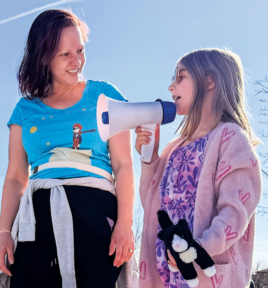 At the group’s recent protest, Horwitz’s daughter, Ada, age 8, spoke into her mom’s megaphone.
