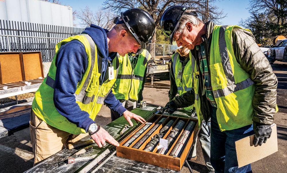 James Hagadorn (left) and Bob Raynolds (right) examine the City Park core drilling in the Denver Museum of Nature & Science parking lot. Photo by Rick Wicker